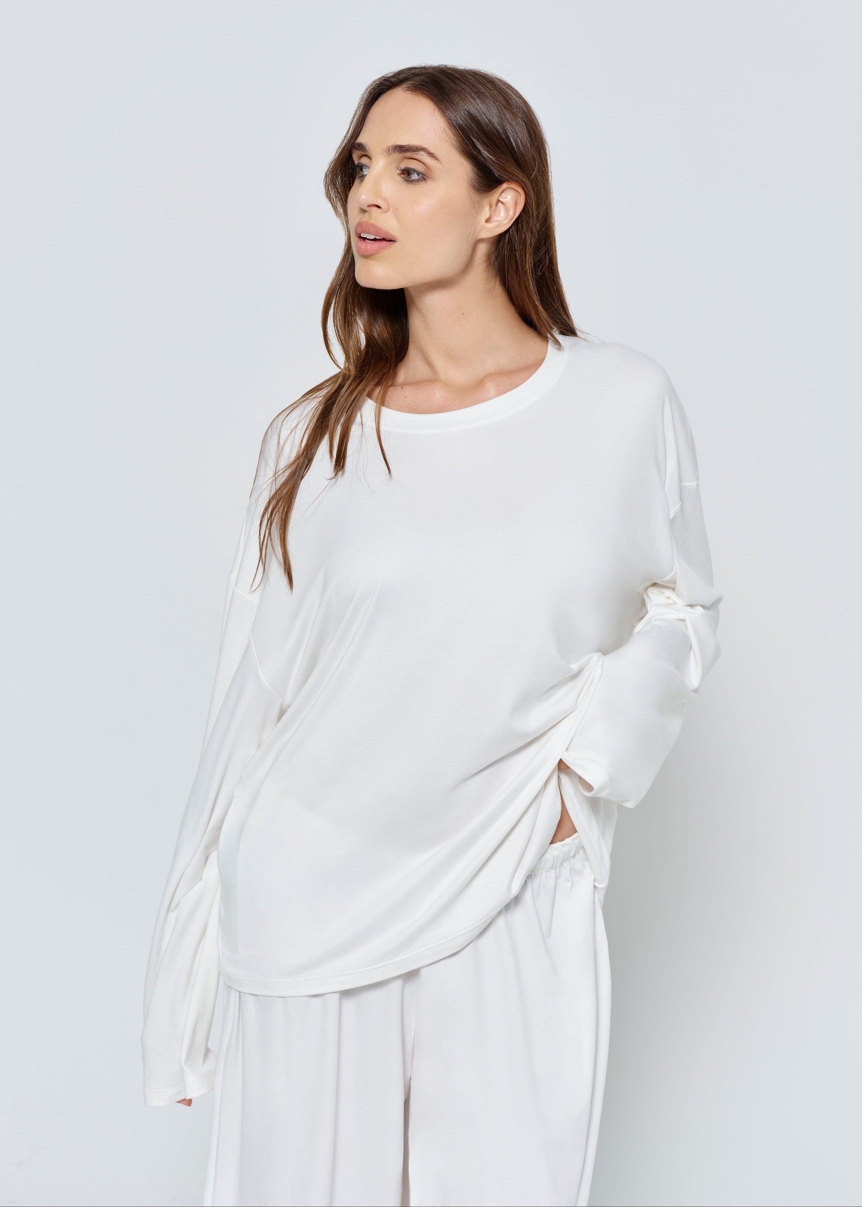 This Oversized Long Sleeve Tee will be the comfiest Tee in your closet! Made from Super Soft 4-Way Stretch Fabric this Long-Sleeve Tee is perfect for lounging. Bumpsuit is made to be worn throughout all stages of life, transitioning with the body as it stretches and grows throughout maternity, postpartum and beyond. Pair with The Cloud Parachute Pant or Cloud Slim Pant for the ultimate lounge outfit!