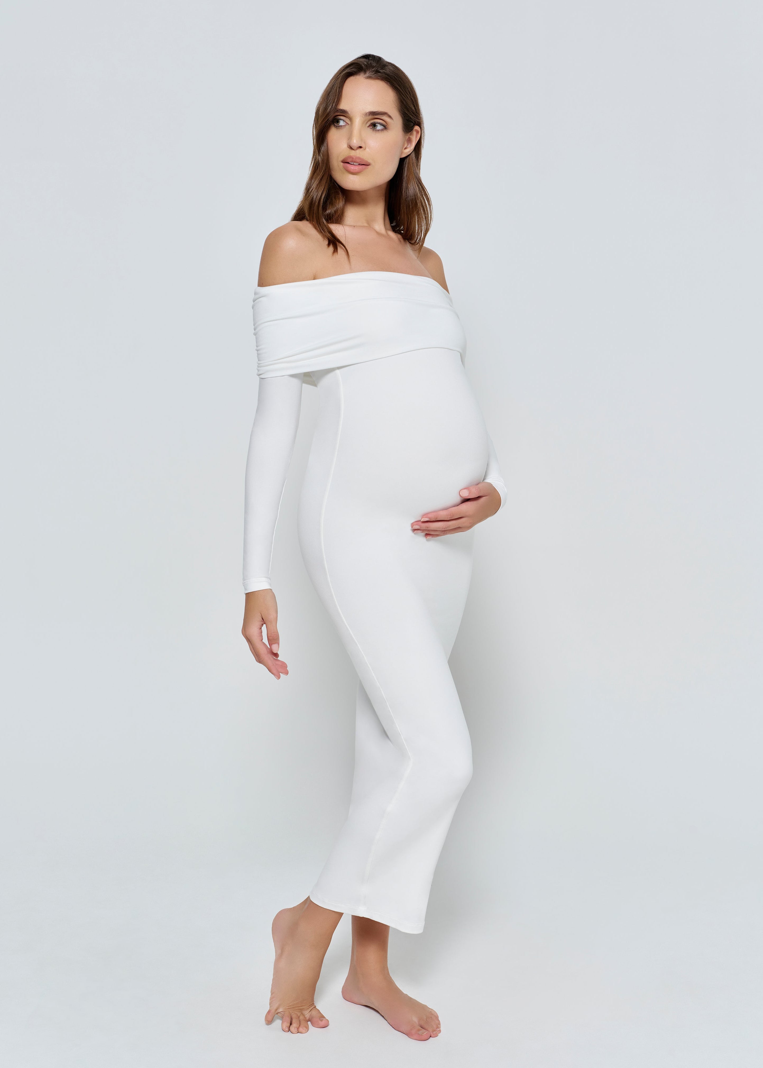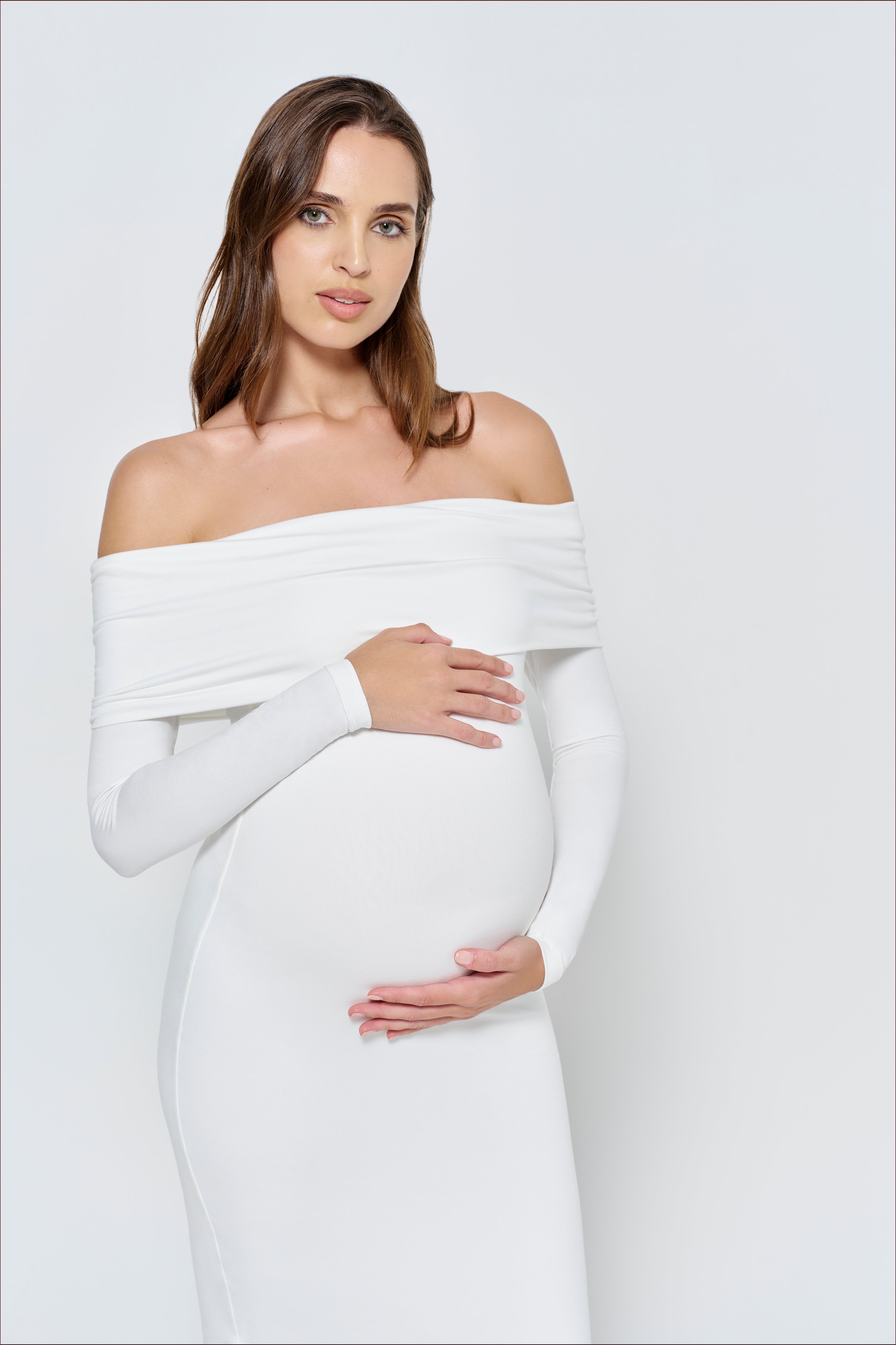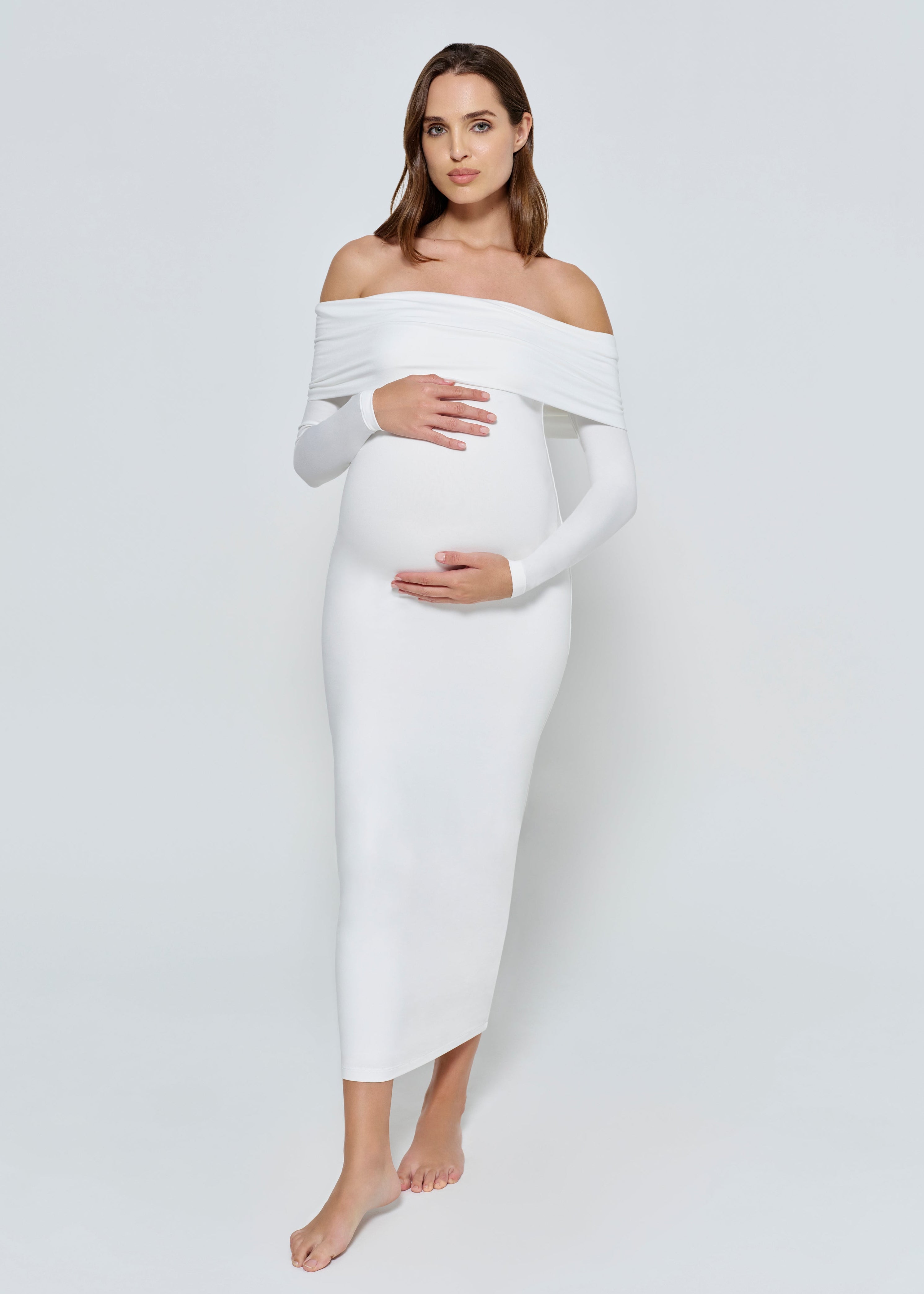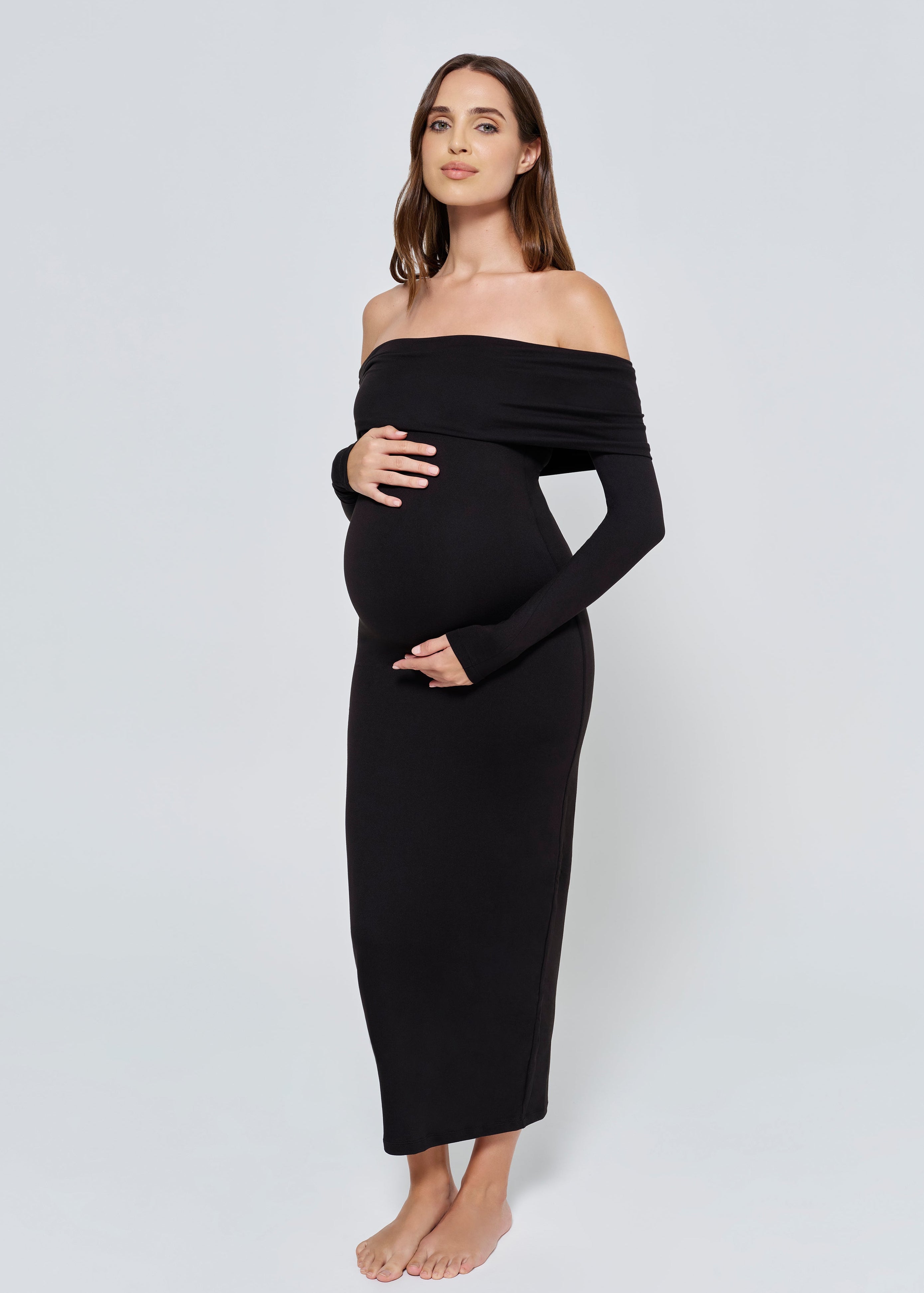 Meet The Alison, your go-to for timeless sophistication and all-day comfort. This off-the-shoulder maxi maternity dress features long sleeves and a flattering silhouette that hugs your body in all the right places. Designed with versatility in mind, it’s perfect for dressing up or keeping it casual, making it an essential addition to your wardrobe. Crafted from our signature stretch fabric, The Alison moves & stretches with you for a flawless fit, whether you’re heading to brunch, a special event, or a cozy evening out. Bumpsuit is made to be worn throughout all stages of life, transitioning with the body as it stretches and grows throughout maternity, postpartum and beyond. The long sleeve design adds just the right touch of elegance, while the off-the-shoulder neckline exudes effortless femininity.