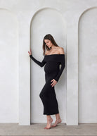 Meet The Alison, your go-to for timeless sophistication and all-day comfort. This off-the-shoulder maxi maternity dress features long sleeves and a flattering silhouette that hugs your body in all the right places. Designed with versatility in mind, it’s perfect for dressing up or keeping it casual, making it an essential addition to your wardrobe. Crafted from our signature stretch fabric, The Alison moves & stretches with you for a flawless fit, whether you’re heading to brunch, a special event, or a cozy evening out. Bumpsuit is made to be worn throughout all stages of life, transitioning with the body as it stretches and grows throughout maternity, postpartum and beyond. The long sleeve design adds just the right touch of elegance, while the off-the-shoulder neckline exudes effortless femininity.