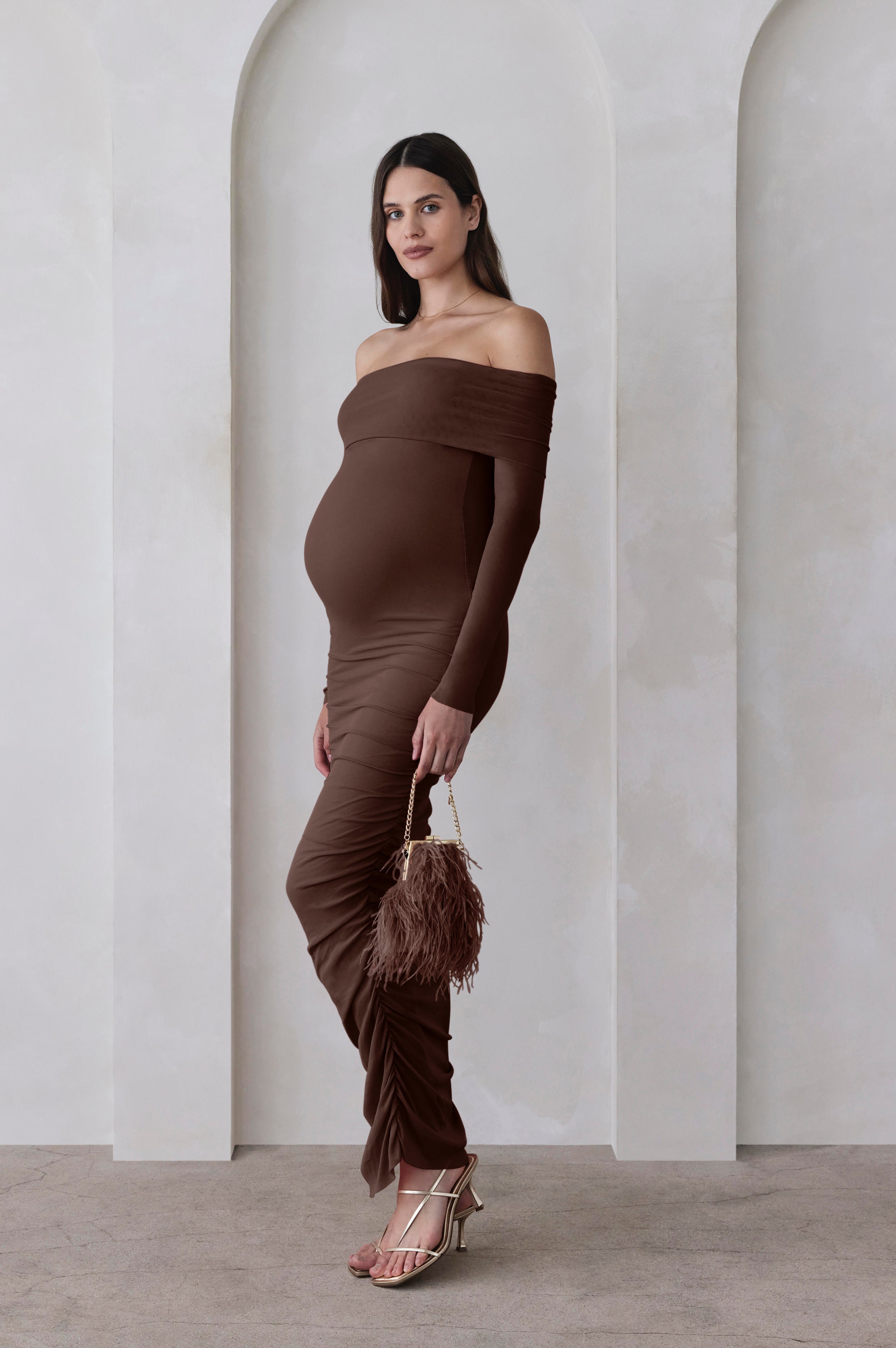 The Perfect Baby Shower and/or Occasion Dress, a must have for your maternity wardrobe! This dress features sheer long sleeves with an off-the-shoulder ruched neckline and bodice. Bumpsuit is made to be worn throughout all stages of life, transitioning with the body as it stretches and grows throughout maternity, postpartum and beyond. The Off The Shoulder Soft Mesh Dress is made from the softest, stretchiest mesh fabric for a comfortable feminine finish, the perfect dressed-up look for maternity and beyond.