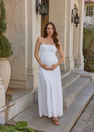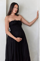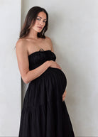 The Shirred Strapless Gown is a stunning tiered maxi gown designed for effortless comfort and style. Featuring shirring at the bust for a flattering fit, adjustable ties, and lightweight, breathable fabric with plenty of stretch, this gown is perfect for any occasion.  Bumpsuit is made to be worn throughout all stages of life, transitioning with the body as it stretches and grows throughout maternity, postpartum and beyond. Elevate your wardrobe with this versatile piece from our exclusive collaboration.