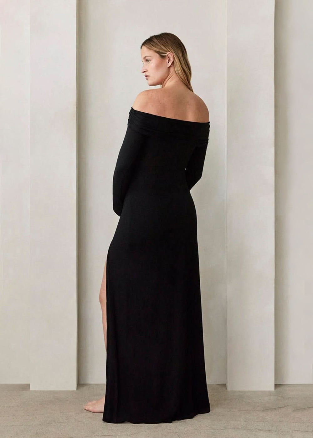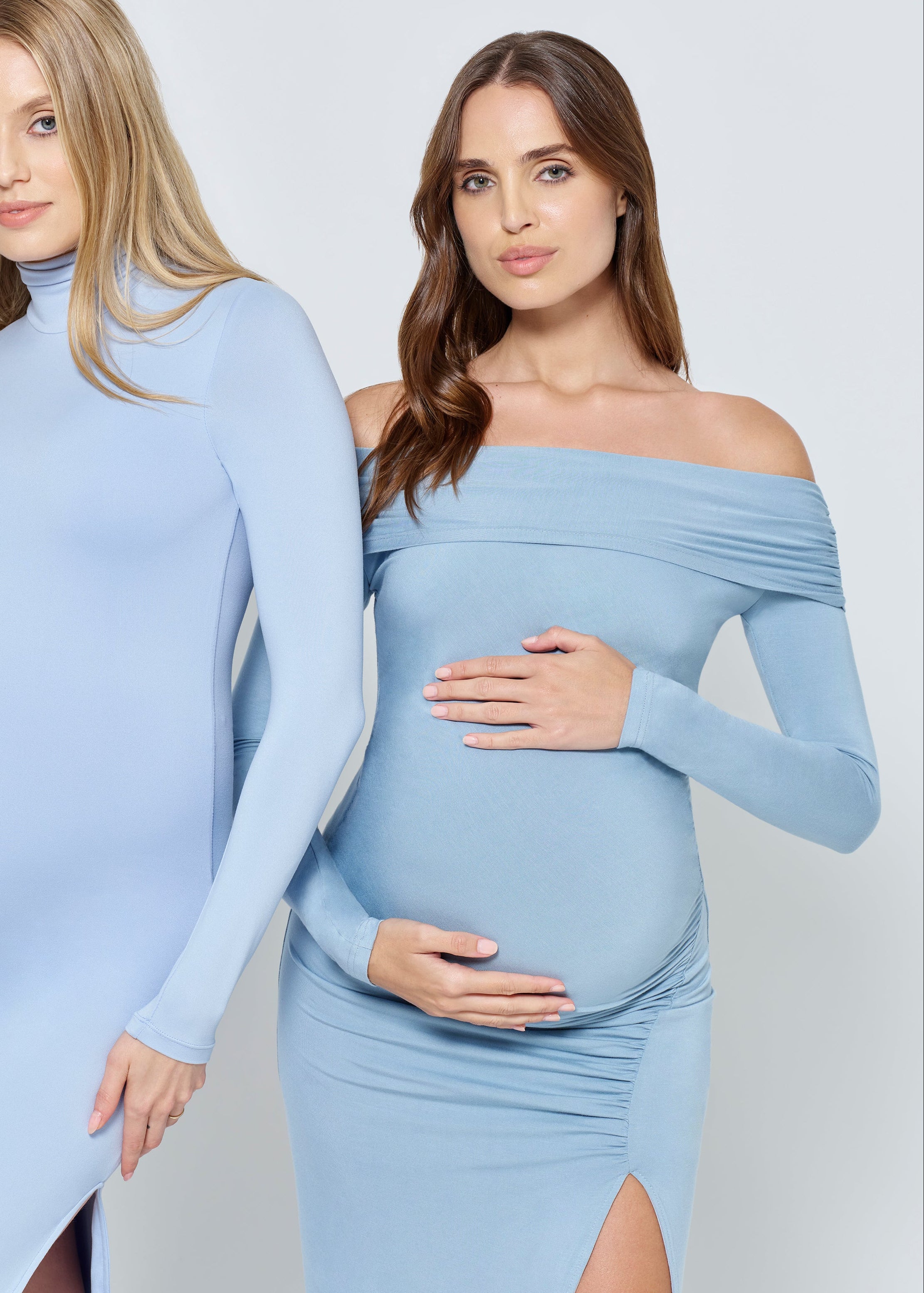 The Off the Shoulder Evening dress is a buttery-soft jersey knit dress with a supportive feminine fit and glamorous off-shoulder neckline. Made from a smooth, slinky jersey knit fabric and double lined for extra support, this style will last you through pregnancy and beyond. She's the perfect fit for any formal occasion. Bumpsuit is made to be worn throughout all stages of life, transitioning with the body as it stretches and grows throughout maternity, postpartum and beyond.