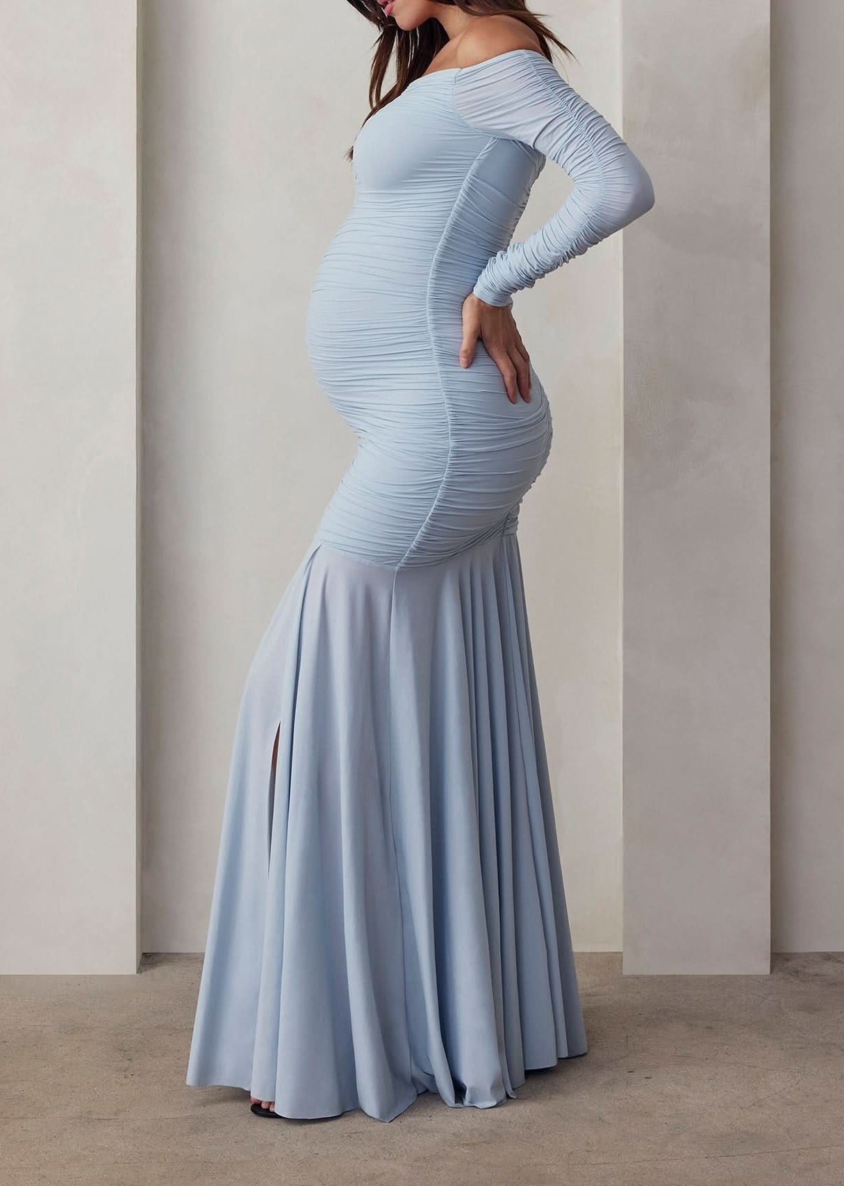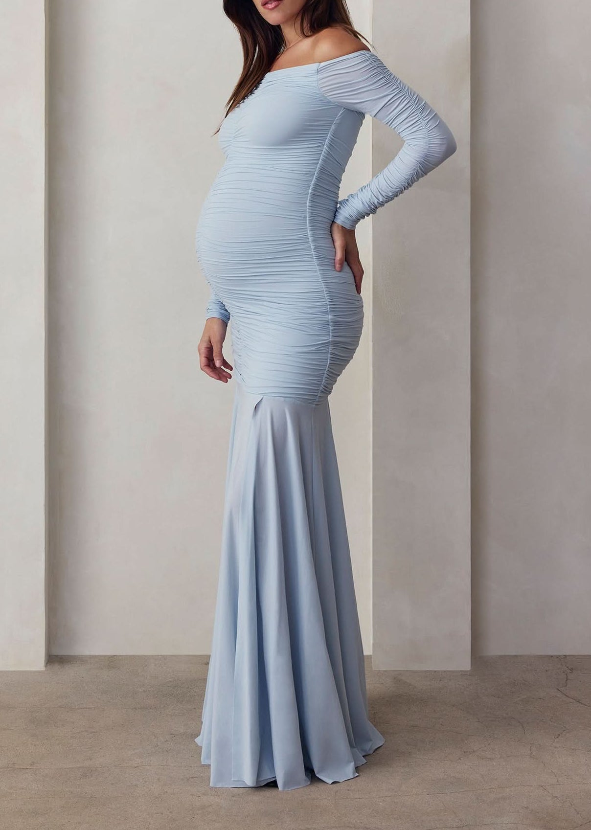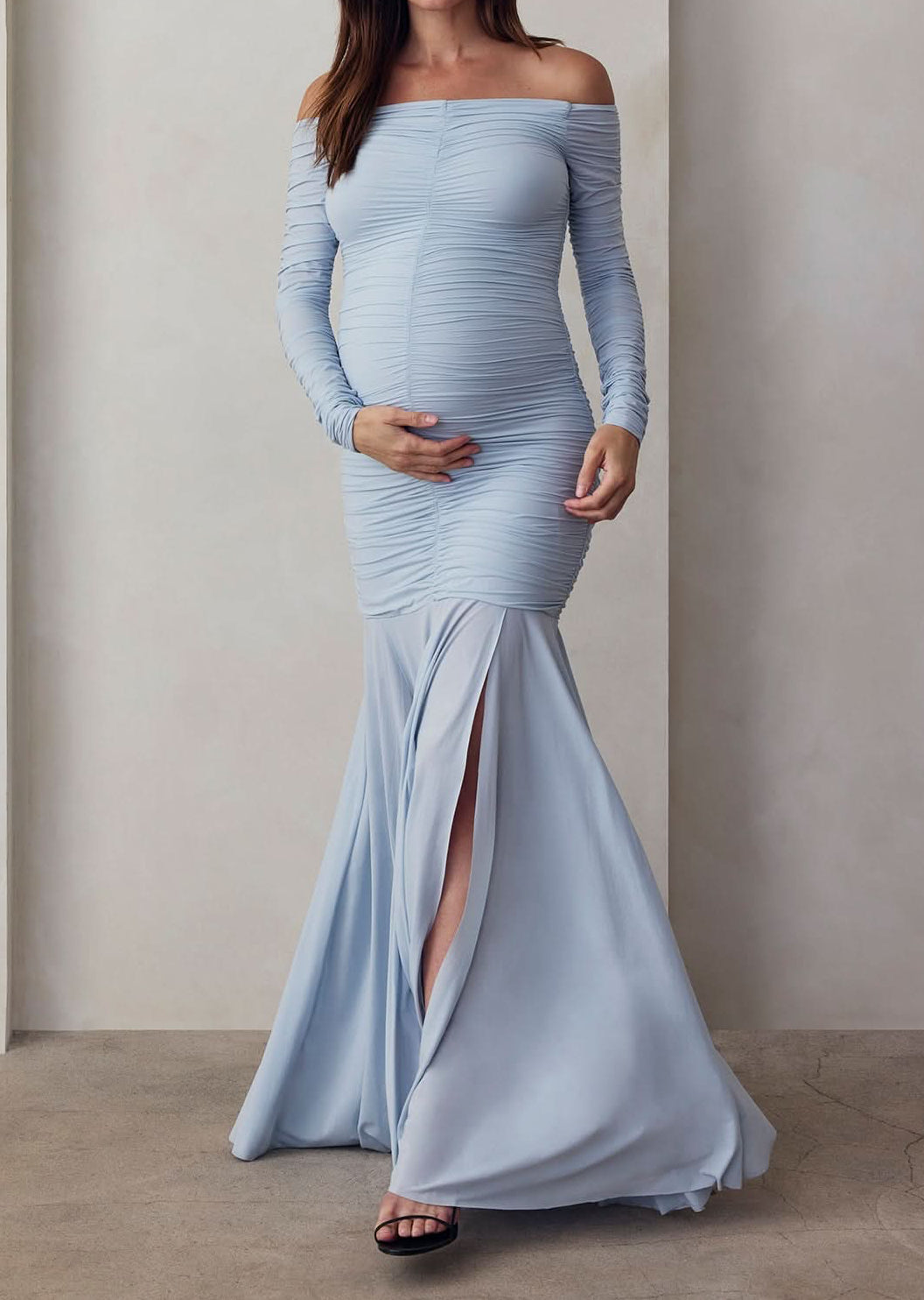 Meet the Perfect Baby Shower Dress, made from our lightweight, breathable, buttery-soft, 4-way stretch Airbrush fabric. This maxi maternity (and beyond) dress is designed to sculpt your figure while keeping you comfortable from morning to midnight. The off-the-shoulder neckline adds a hint of sophistication, while the sleek silhouette at bodice that flares into a beautiful skirt adds grace & poise to the look. The double-lined bodice offers extra support, and the flowy maxi length creates a polished, streamlined look. Bumpsuit is made to be worn throughout all stages of life, transitioning with the body as it stretches and grows throughout maternity, postpartum and beyond.
